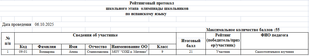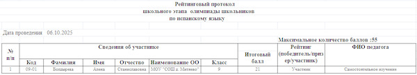 Рейтинговый протокол школьного этапа олимпиады школьников по испанскому языку
